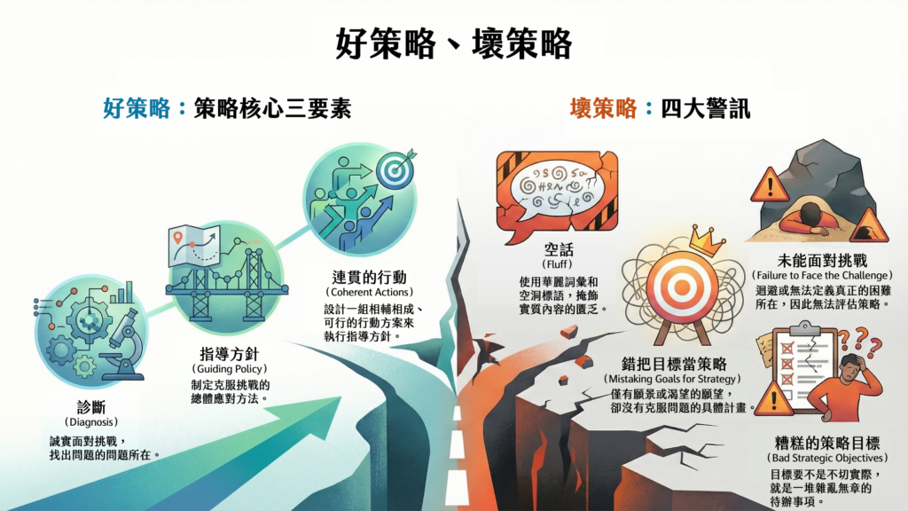 一個壞策略,往往就是因為這個三角形的崩解。例如,若只有「指導方針」(如「成為市場領導者」)和「連貫行動」(如增加研發、擴大銷售),卻缺乏對挑戰的「診斷」,組織的力量將會用錯方向,徒勞無功。