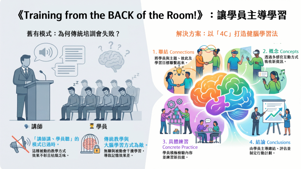 在企業訓練與教學設計領域中,「如何讓學習者真正記得、用得出來」始終是一項挑戰。多數傳統課程仍停留在「老師講、學員聽」的線性模式,然而《Training from the BACK of the Room!》直指問題核心:我們其實講太多,學員卻學得太少