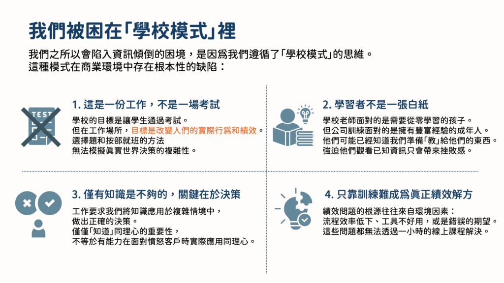 如果我們只是一再丟出「資訊+測驗」,其實只是創造一堆短暫記憶+學員反感,對真正的工作表現幫助有限。