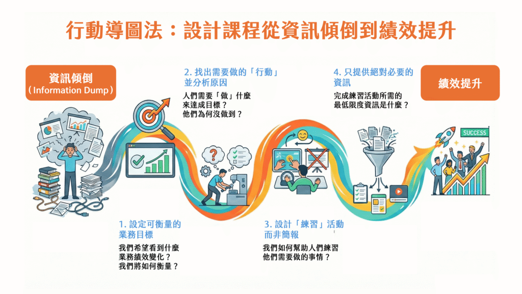 在傳統課程裡,我們常常花大量時間在組織內容、寫說明、做投影片。但在 Action Mapping 架構中,順序被刻意顛倒: