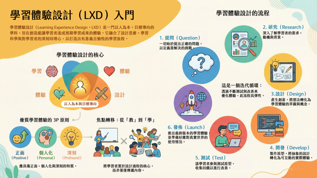 學習體驗設計(LXD)是一個創造學習體驗的過程,它使學習者能夠以人性化為中心和目標為導向的方式,達成預期的學習成果。
