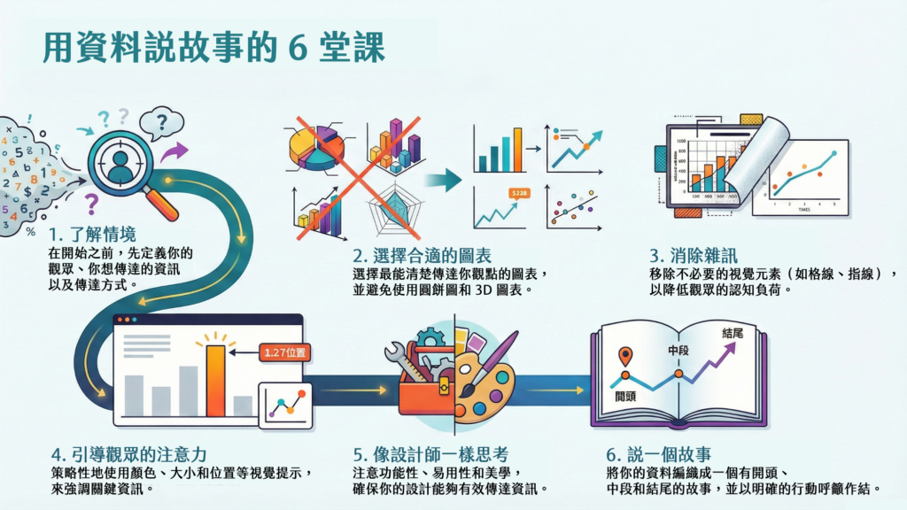 本書的核心並非零散的技巧,而是一套系統性的六步驟方法論。它引導我們從策略規劃開始,逐步完成圖表設計、焦點引導,最終以一個引人入勝的故事結尾。本節將逐一解析這六堂課,揭示如何將原始資料轉化為一個具備影響力的溝通工具。